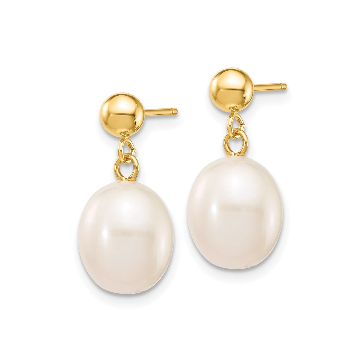 14k Yellow Gold Dangle Earrings with Oval White Freshwater Pearls, Drop Stud Design for Women