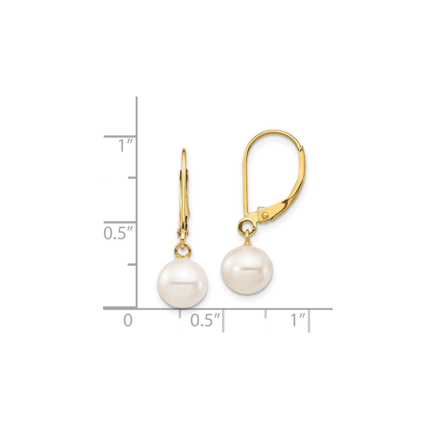 Crafted from lustrous 14k yellow gold, these leverback earrings offer both secure wear and luxurious charm. Graceful white pearls delicately hang from gold leverbacks to form elegant freshwater pearl earrings with a lightweight design that's perfect for extended wear. Whether you're looking for women's pearl earrings to match a sleek evening look or want a standout touch for that special event, these earrings rise to the occasion beautifully.