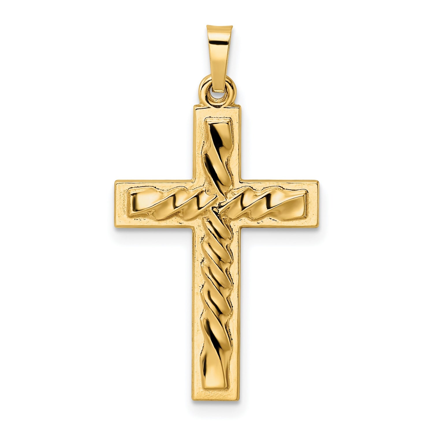 Introducing the Polished and Twisted Hollow Cross Charm Pendant, a masterpiece crafted in real 14k yellow gold. This exquisite piece of jewelry is designed to add a touch of elegance and spirituality to your collection.