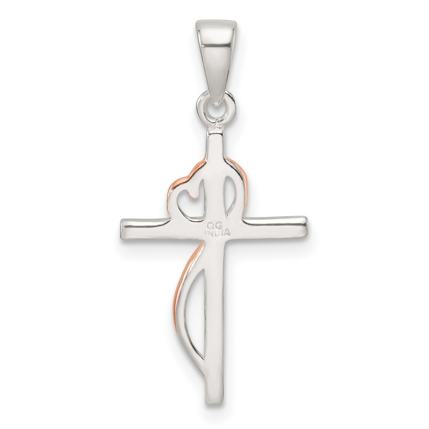 Sterling Silver Cross Pendant with Cubic Zirconia and Rose Gold Heart Accent, Dual Tone Design