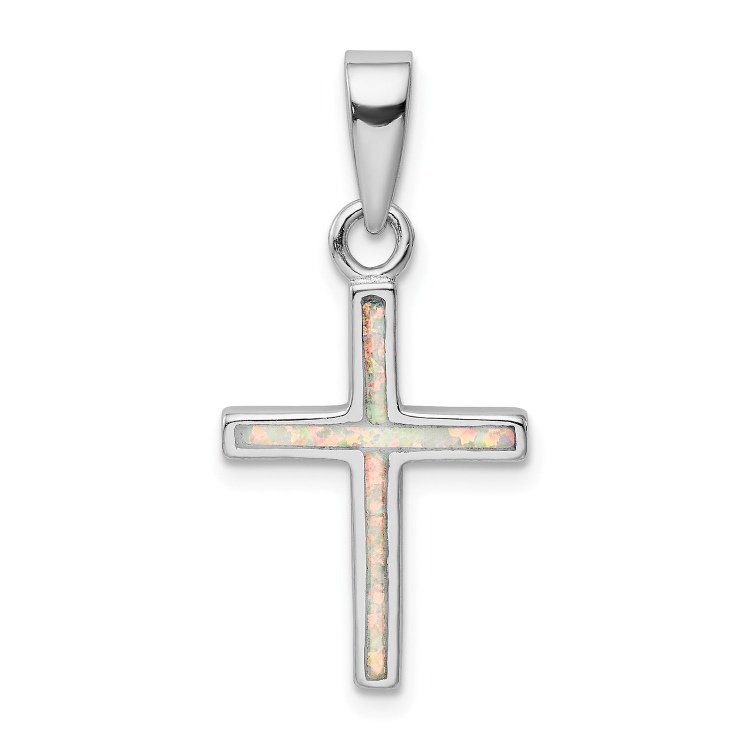 Sterling Silver Cross Pendant with Lab Created Opal Inlay, Minimalist Spiritual Design