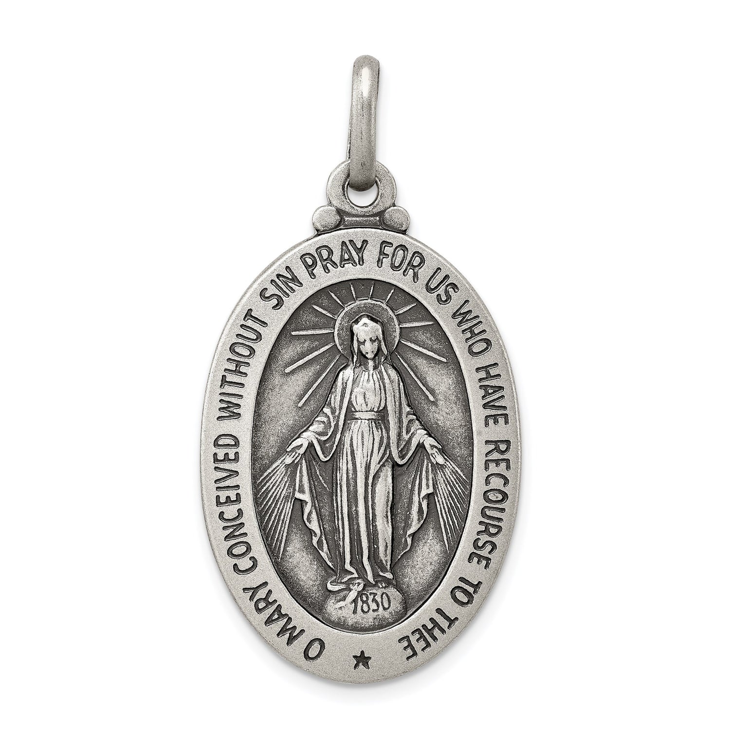 Sterling Silver Miraculous Medal Pendant with Virgin Mary and Inscription