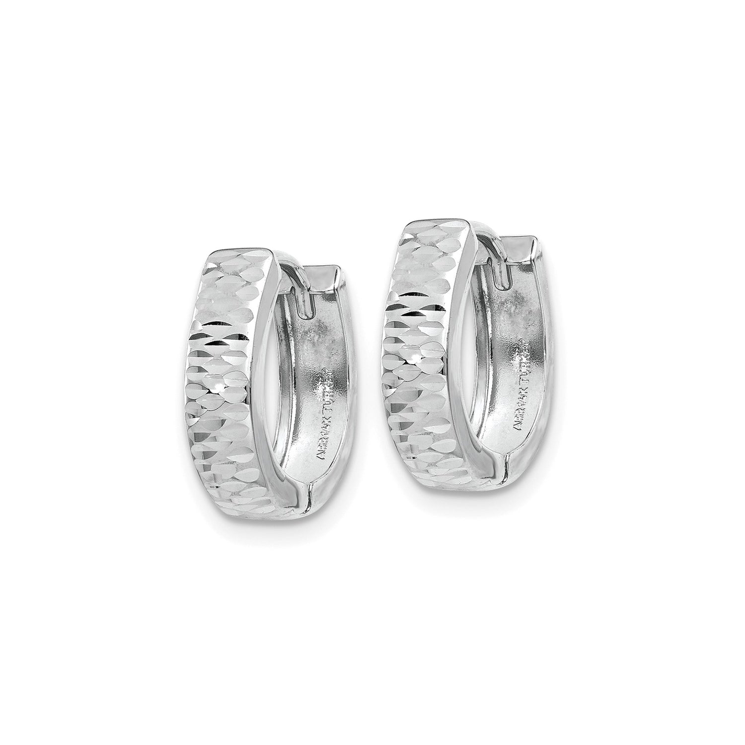 14k White Gold Hoop Earrings, Faceted Diamond Cut Texture, Huggie Style, Hinged Closure