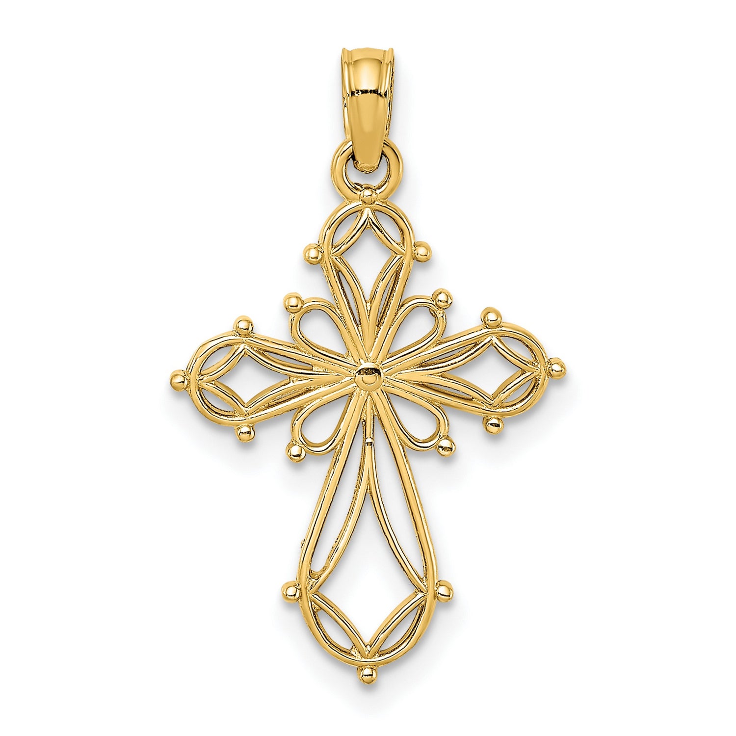 10k Yellow Gold Cross Pendant with Open Filigree Floral Design, Lightweight Religious Charm