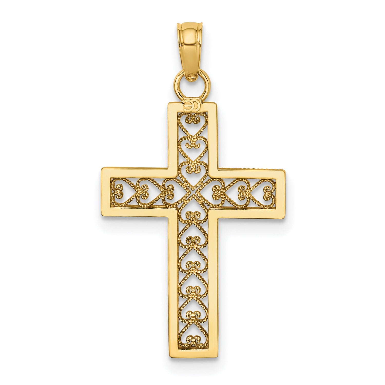 10k Yellow Gold Cross Pendant with Filigree and Diamond-Cut Detailing, Openwork Hearts Design