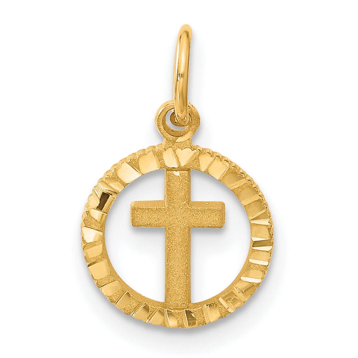 10k Yellow Gold Cross Pendant with Textured Circle Frame and Matte Finish for Men and Women