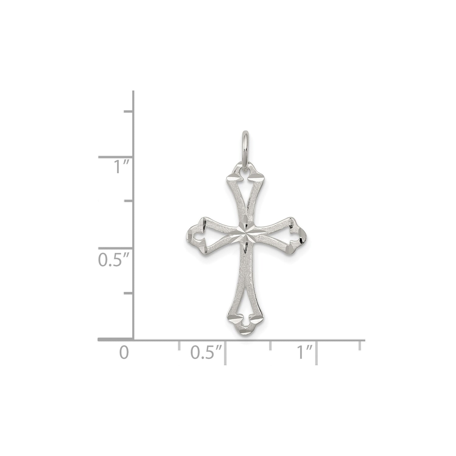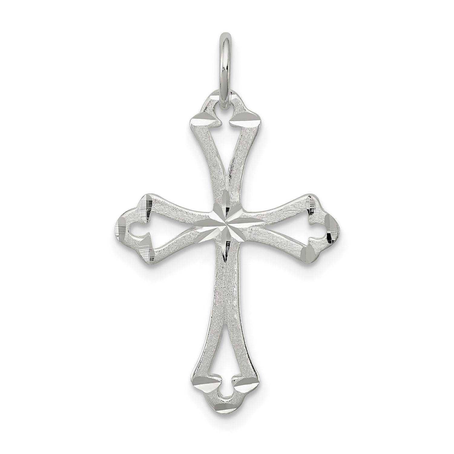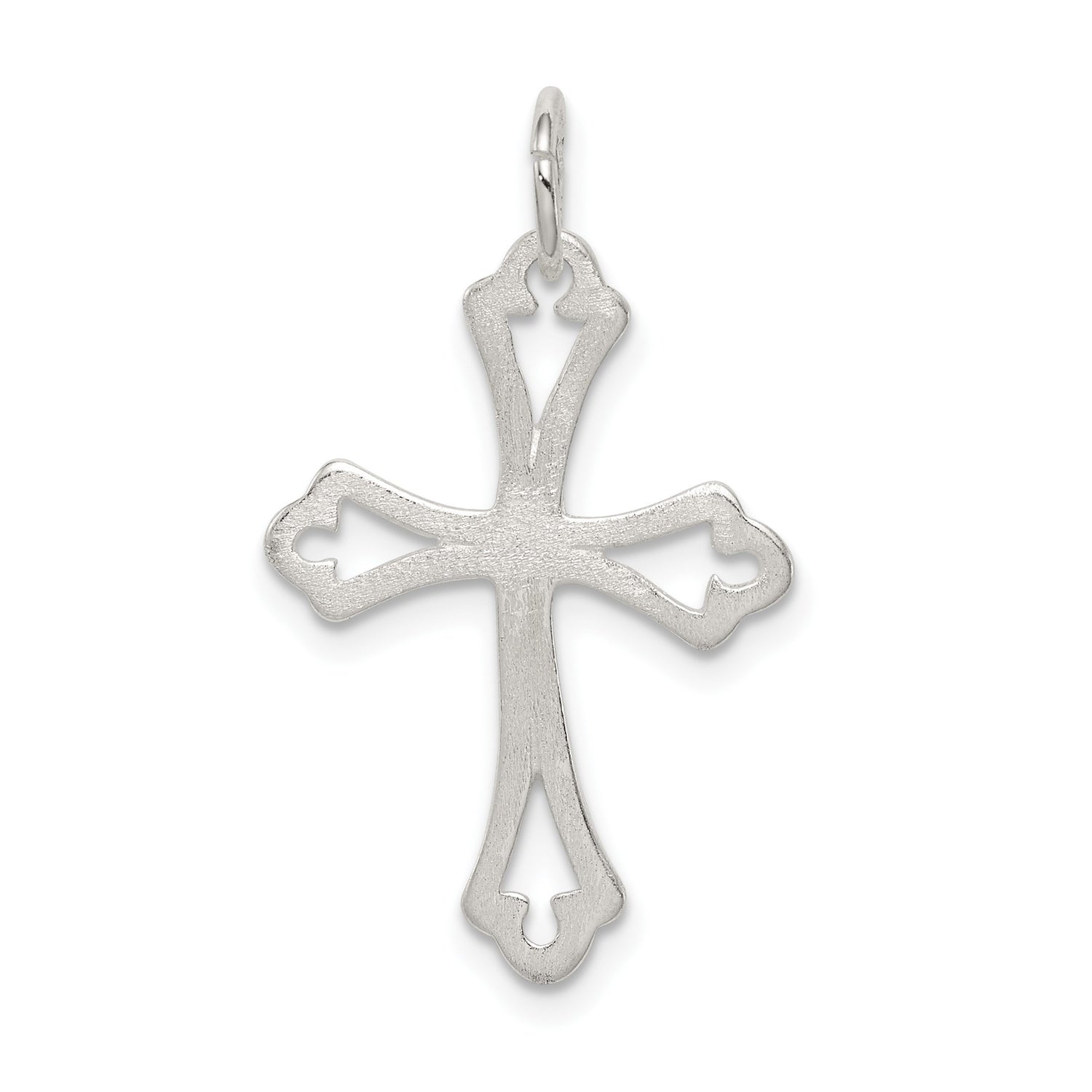 Sterling Silver Cross Pendant with Beveled Edge, Satin Finish, Flared Tips, and Openwork Design