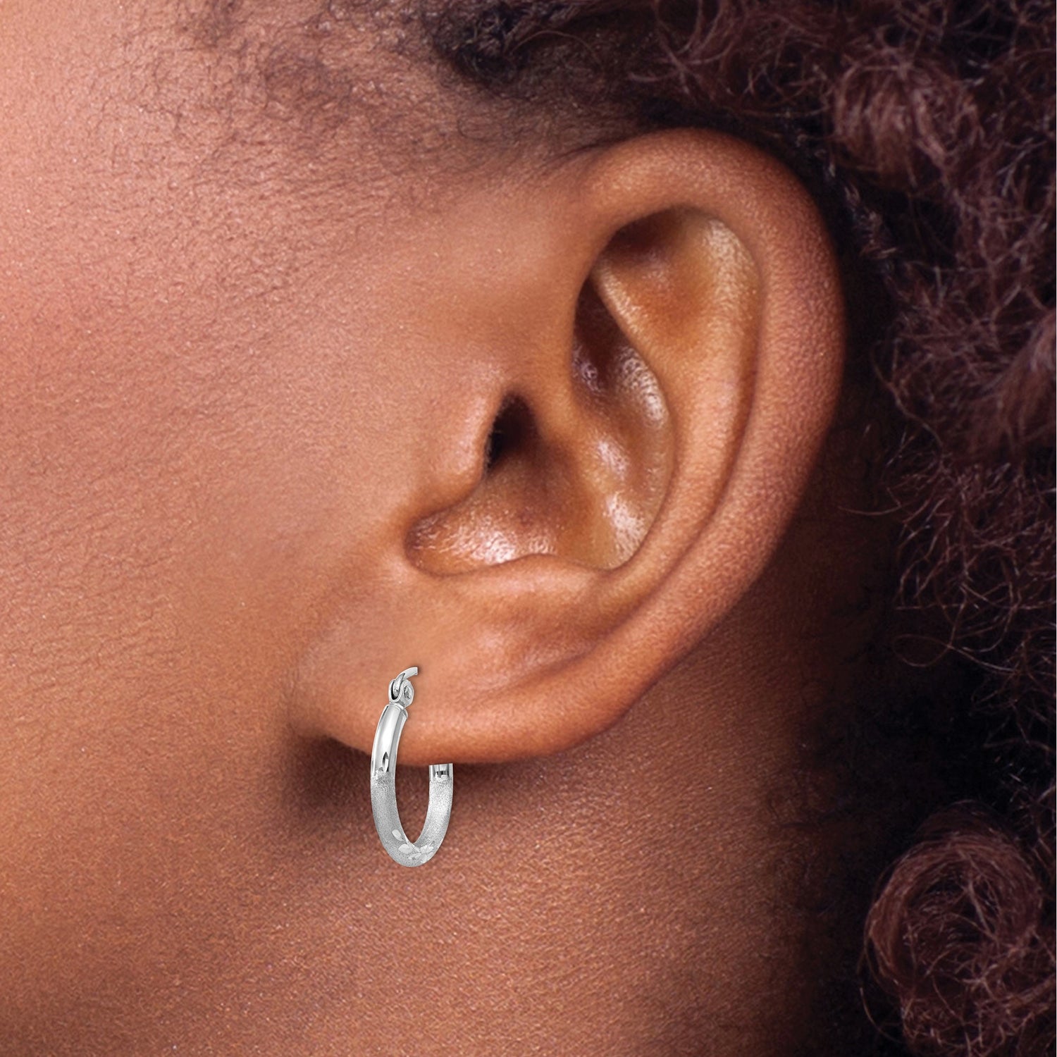 Ideal for building your daily jewelry rotation, these fine white gold hoops bring together versatility and beauty in one pair of textured gold hoops. Whether you reach for them during busy mornings or pair them with layered accessories, these lightweight gold earrings for women redefine daily wear gold hoops with their feminine gold design and polished satin accents.