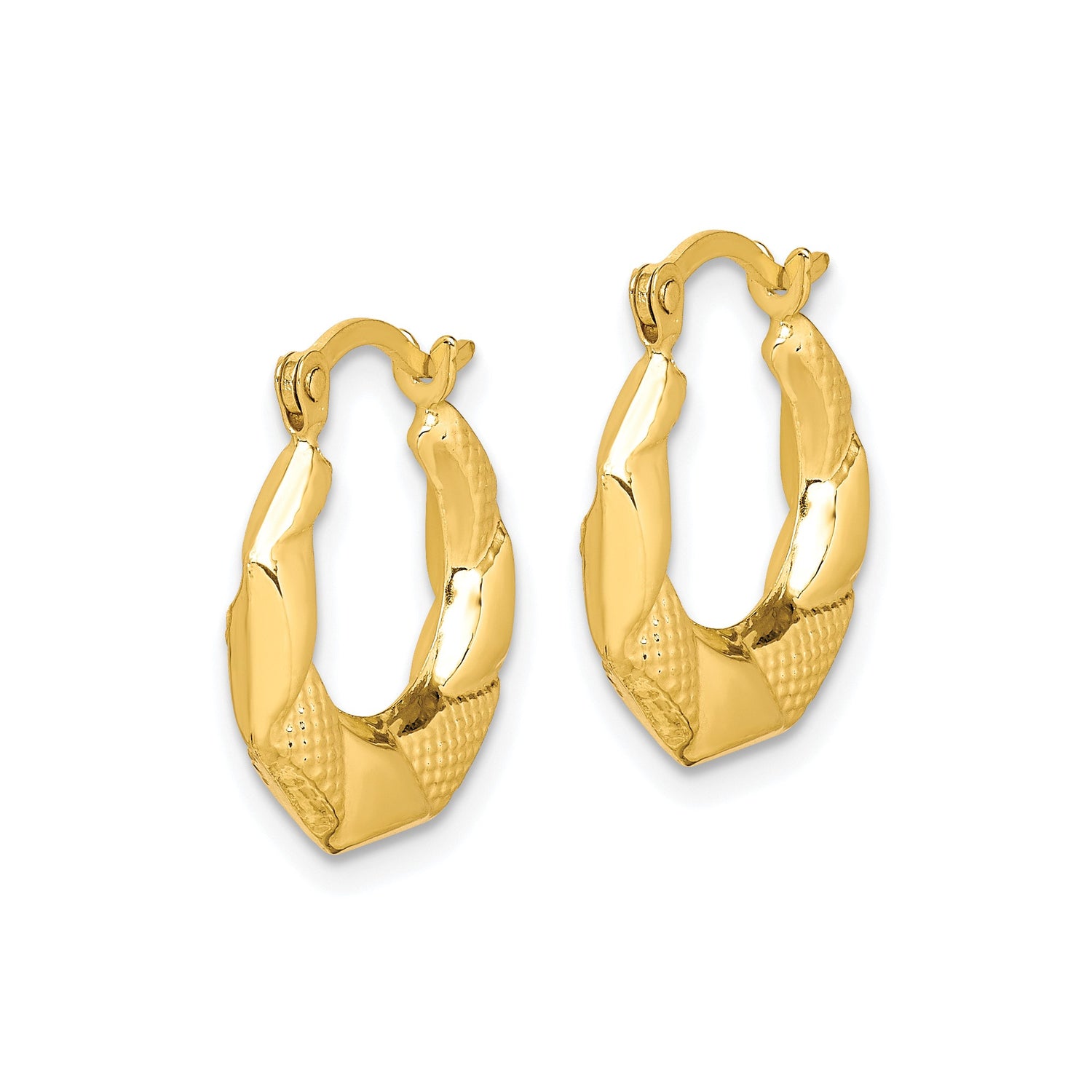 10k Yellow Gold Hoop Earrings, Octagonal Shape with Textured Diamond Cut Finish