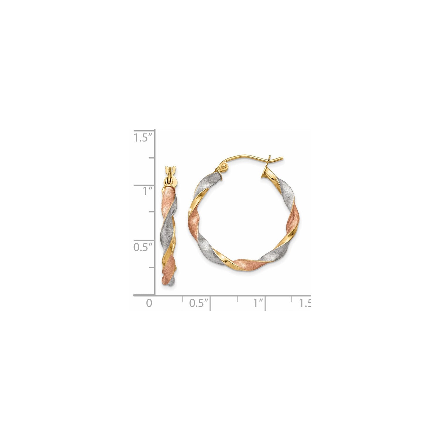 14k Tri-Color Gold Hoop Earrings with Twisted Yellow, Rose, and Rhodium Finish, Satin Texture