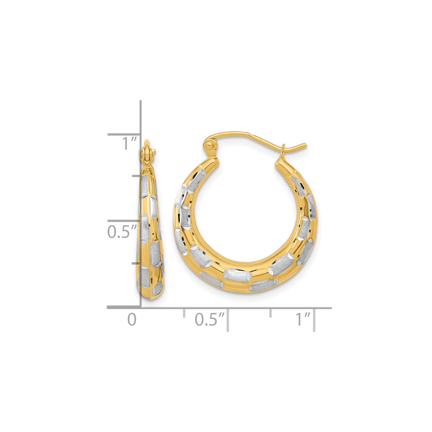14k Yellow Gold Hoop Earrings, Textured Oval Design with Rhodium Two-Tone Finish for Women