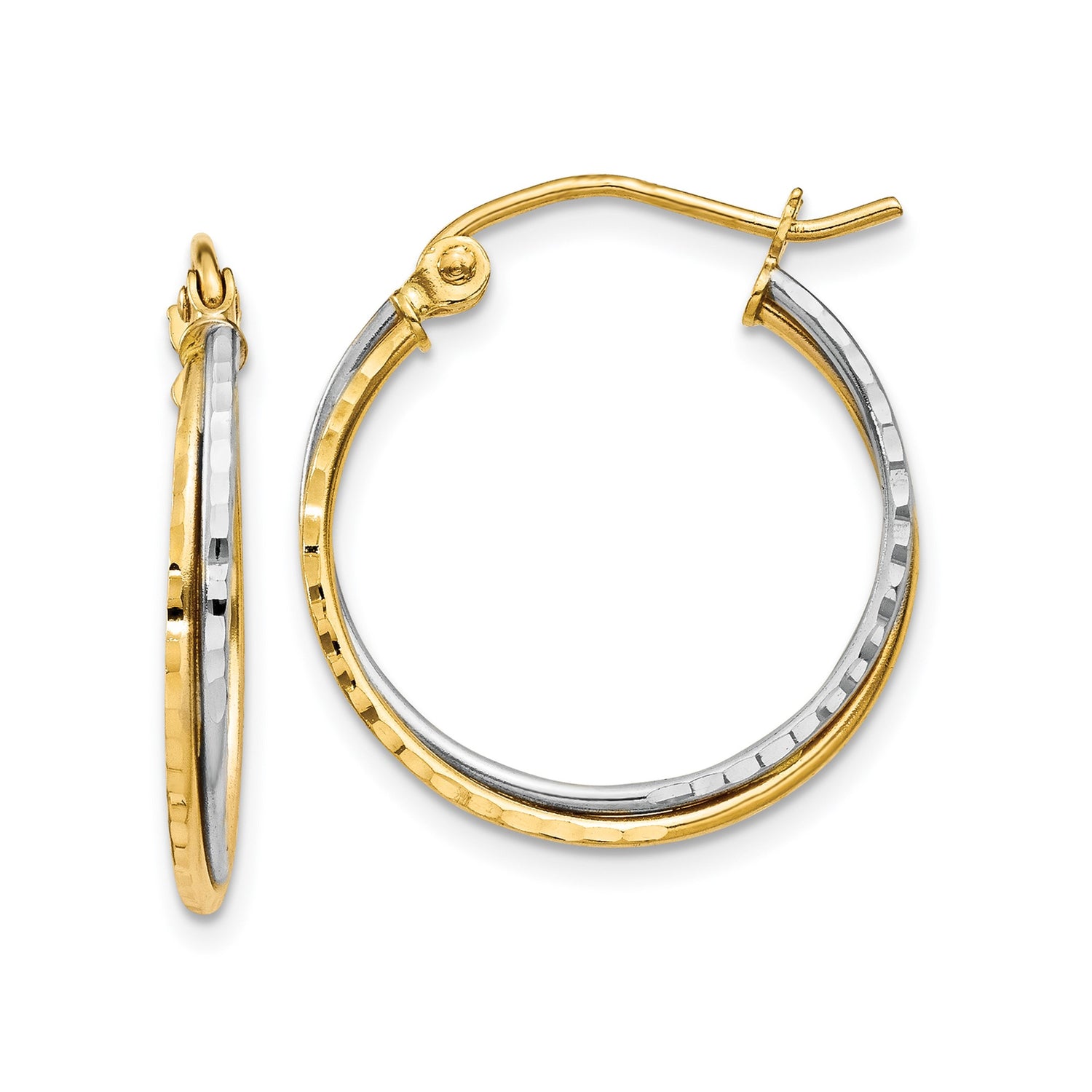 Elevate Your Collection With These Stylish Gold Earrings That Merge the Classic With the Contemporary. The Textured Hammered Gold Hoops and Smooth Polished Sections Result in a Beautiful Juxtaposition That Defines Luxury Gold Fashion Hoops. Perfect as Everyday Gold Earrings or as Part of a More Daring Ensemble, These White and Yellow Hoops Celebrate Mixed Metals in a Silhouetted Form Thats Both Simple and Statement-Making.