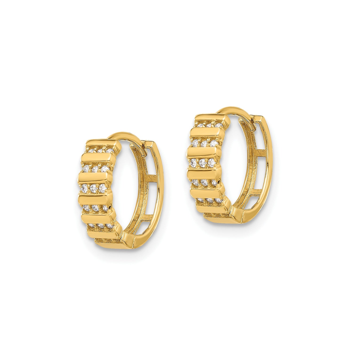 Crafted for Comfort and Classic Beauty, These Ribbed Cz Gold Hoops Feature a Minimal Design with a Hinged Closure That Allows for Easy Wear. The High Polish Gold Surface Reflects Light Beautifully, Enhancing the Sparkle of Each White Stone. These Stylish Everyday Earrings Bring a Contemporary Edge to Any Look While Maintaining the Timeless Grace of Gold Jewelry.