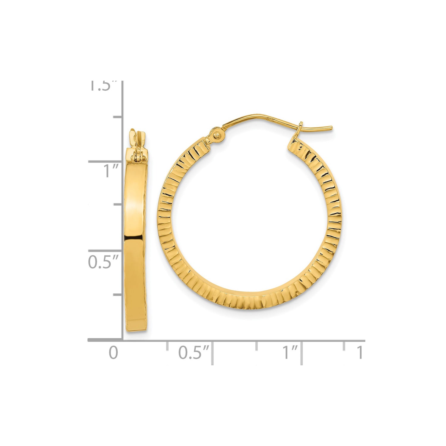 14k Yellow Gold Hoop Earrings with Textured Ridged Design, Polished Finish, Lightweight Medium Size