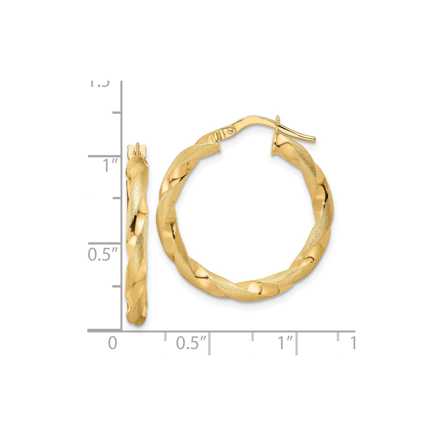 Elevate Your Accessory Game With These Elegant Womens Hoop Earrings. The Satin Textured Earrings Seamlessly Blend With Casual Favorites Or Professional Attire, While The Polished Twisted Hoops Add A Subtle Sparkle Ideal For Evening Occasions. Thoughtfully Constructed From Lustrous Yellow Gold, These Refined Polished Gold Hoops Bring Beauty To Every Moment With A Graceful Presence.