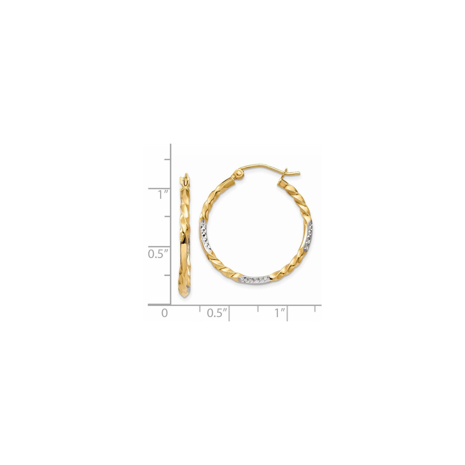 14k Yellow Gold Twisted Hoop Earrings, Two-Tone Rhodium Diamond Cut Design