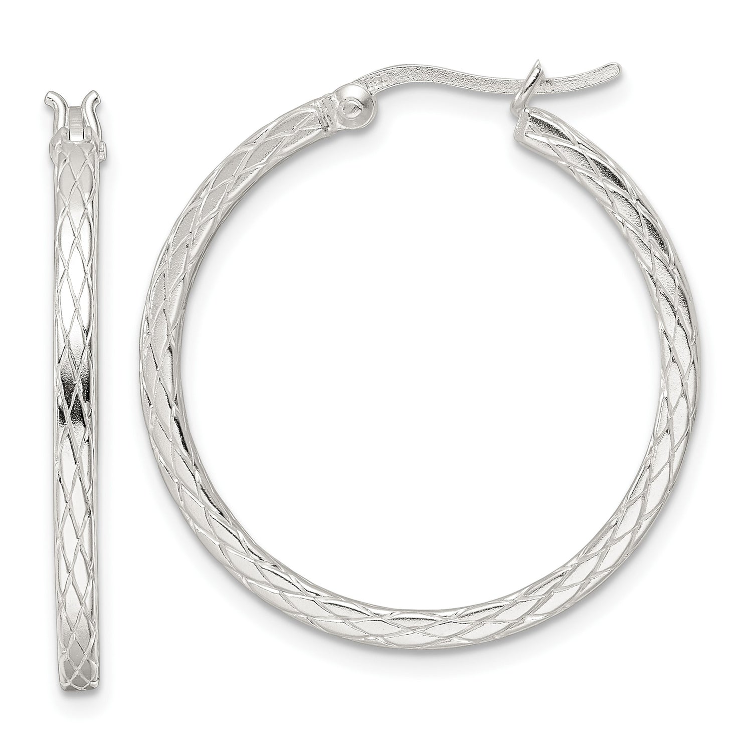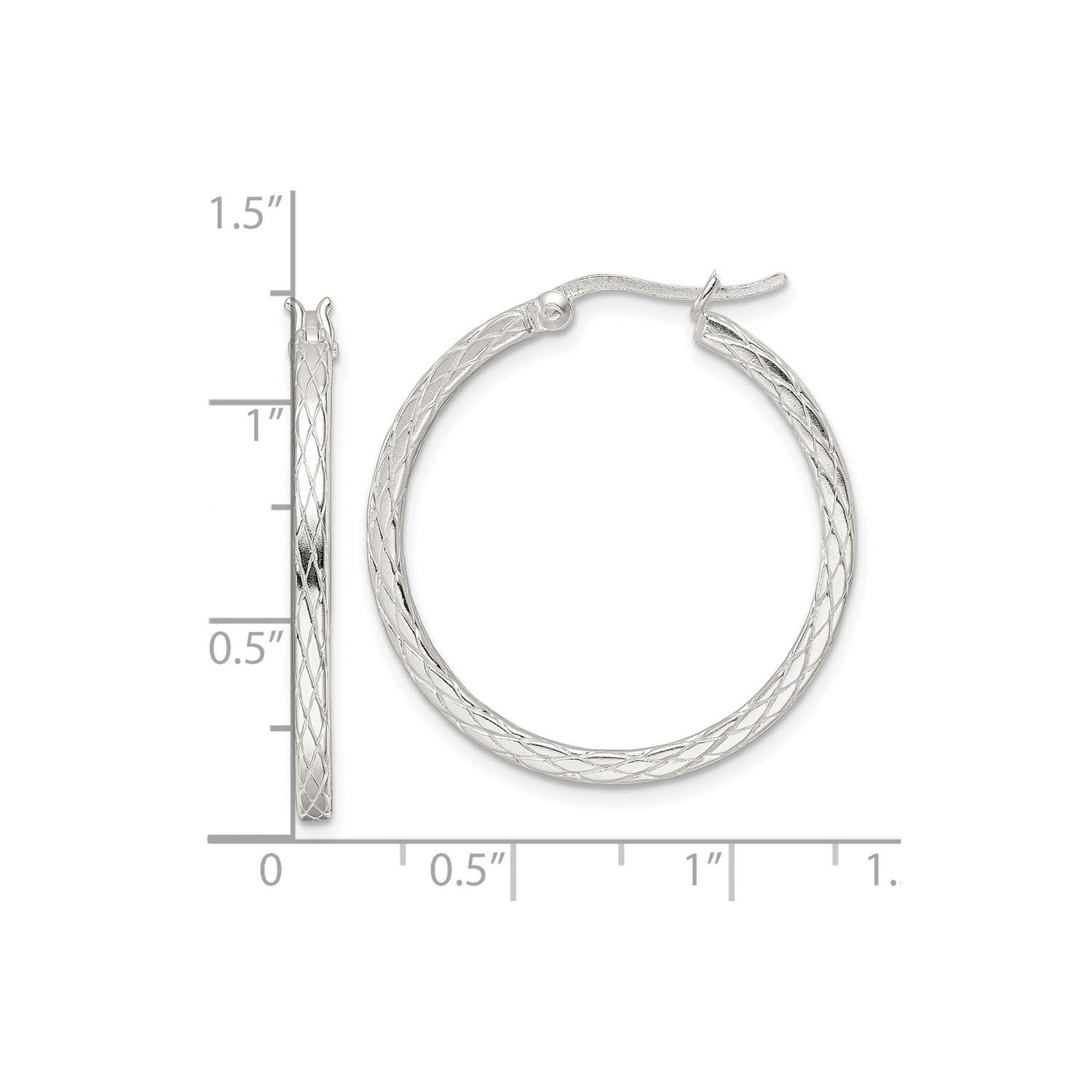Sterling Silver Hoop Earrings with Diamond Cut Crisscross Pattern and Latch Back Closure