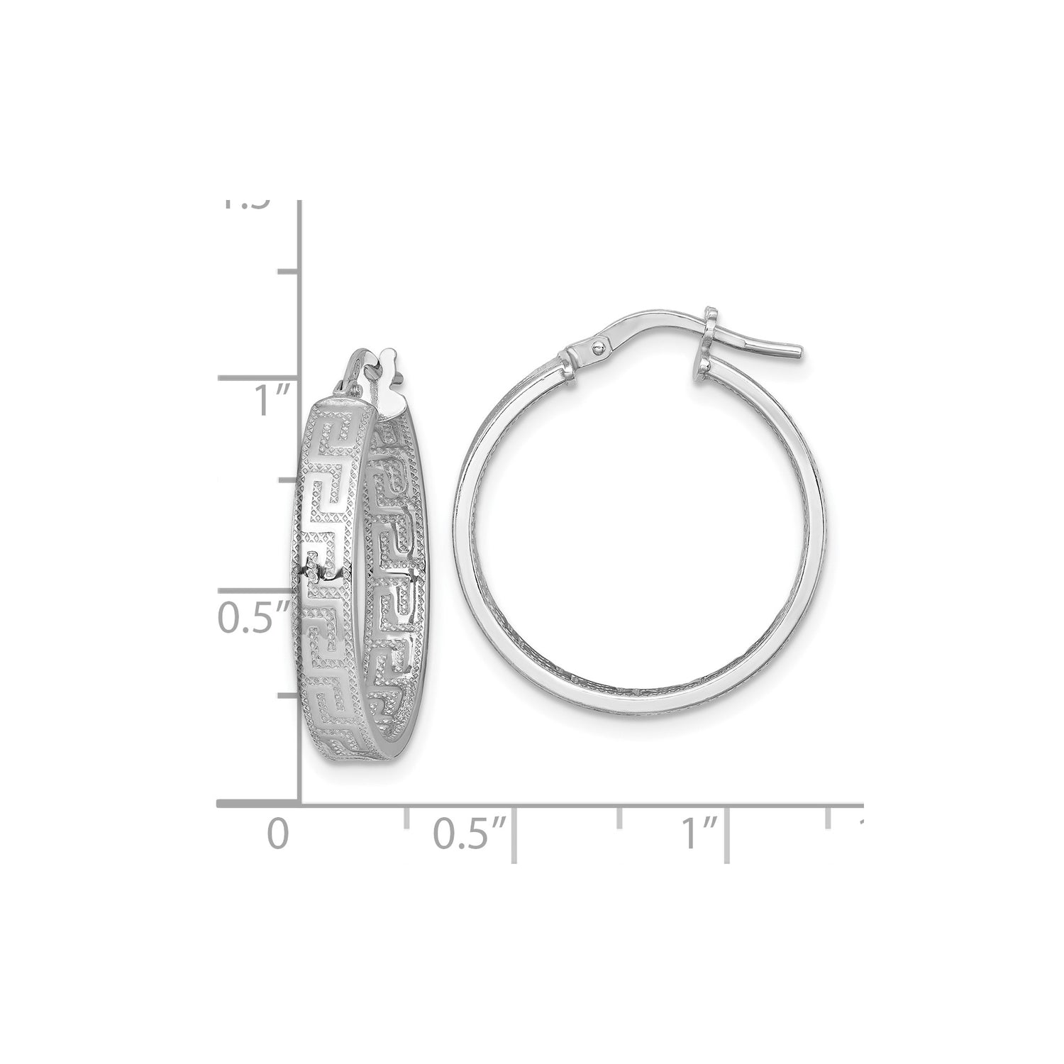 Sterling Silver Hoop Earrings with Greek Key Etched Pattern, Rhodium Plated, Infinity Style