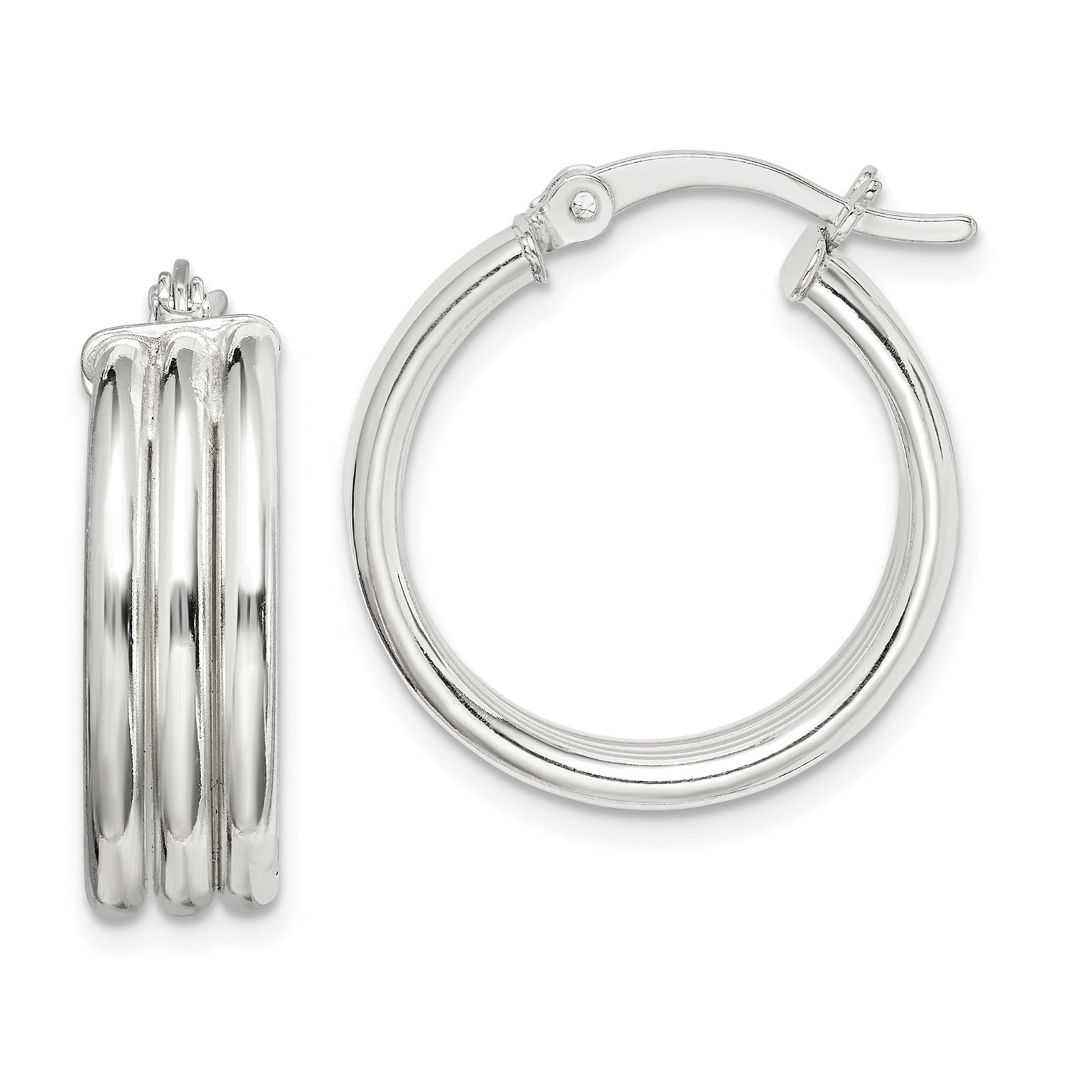 Crafted for effortless sophistication, these sterling silver hoop earrings combine elegance and modern design in a triple layered silhouette. With a lightweight feel and smooth silver finish, these polished earrings deliver the perfect balance between subtle charm and contemporary style. Their clean lines and refined shape make them a polished addition to any jewelry collection, ideal for everyday wear or a sleek complement to more formal attire.
