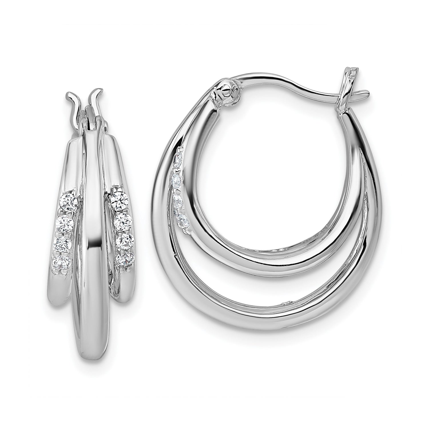 Sterling Silver Triple Oval Hoop Earrings with Cubic Zirconia Accents, Rhodium Plated Layered Design