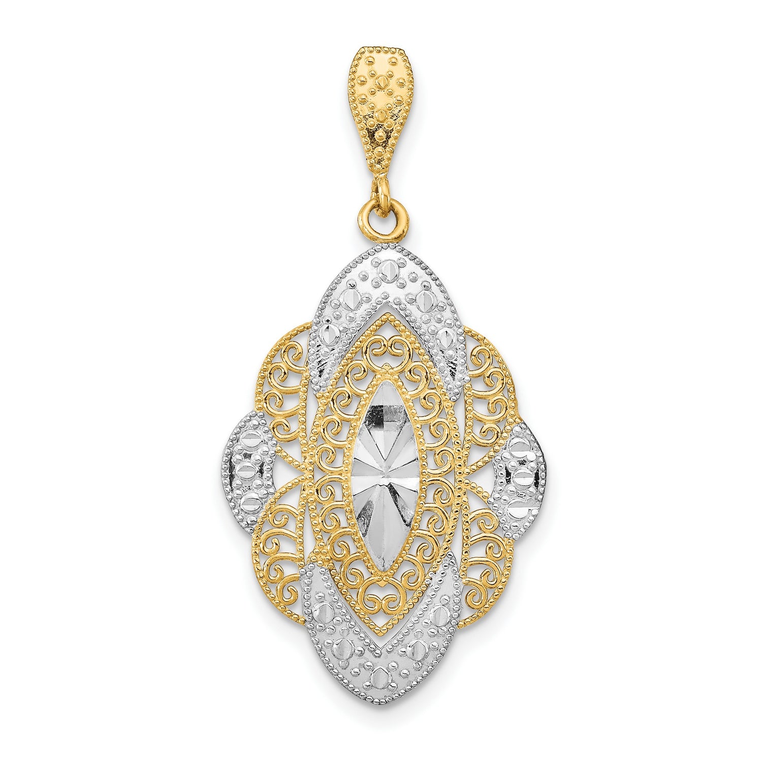 14k Multi-Tone Gold Pendant with Ornate Rhodium Accents, Filigree, Vintage Baroque Design